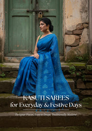 Elegant tussar saree with Kasuti striped borders inspired by leheriya patterns, paired with a unique printed Kalamkari blouse. A graceful blend of tradition and artistry.