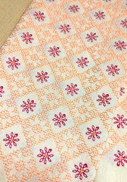 Featuring delicately embroidered Kasuti geometric flowers in a grid garden pattern, this unstitched blouse in blended semi-raw silk showcases all-over thread embroidery—perfect to pair with silk sarees and traditional jewellery.