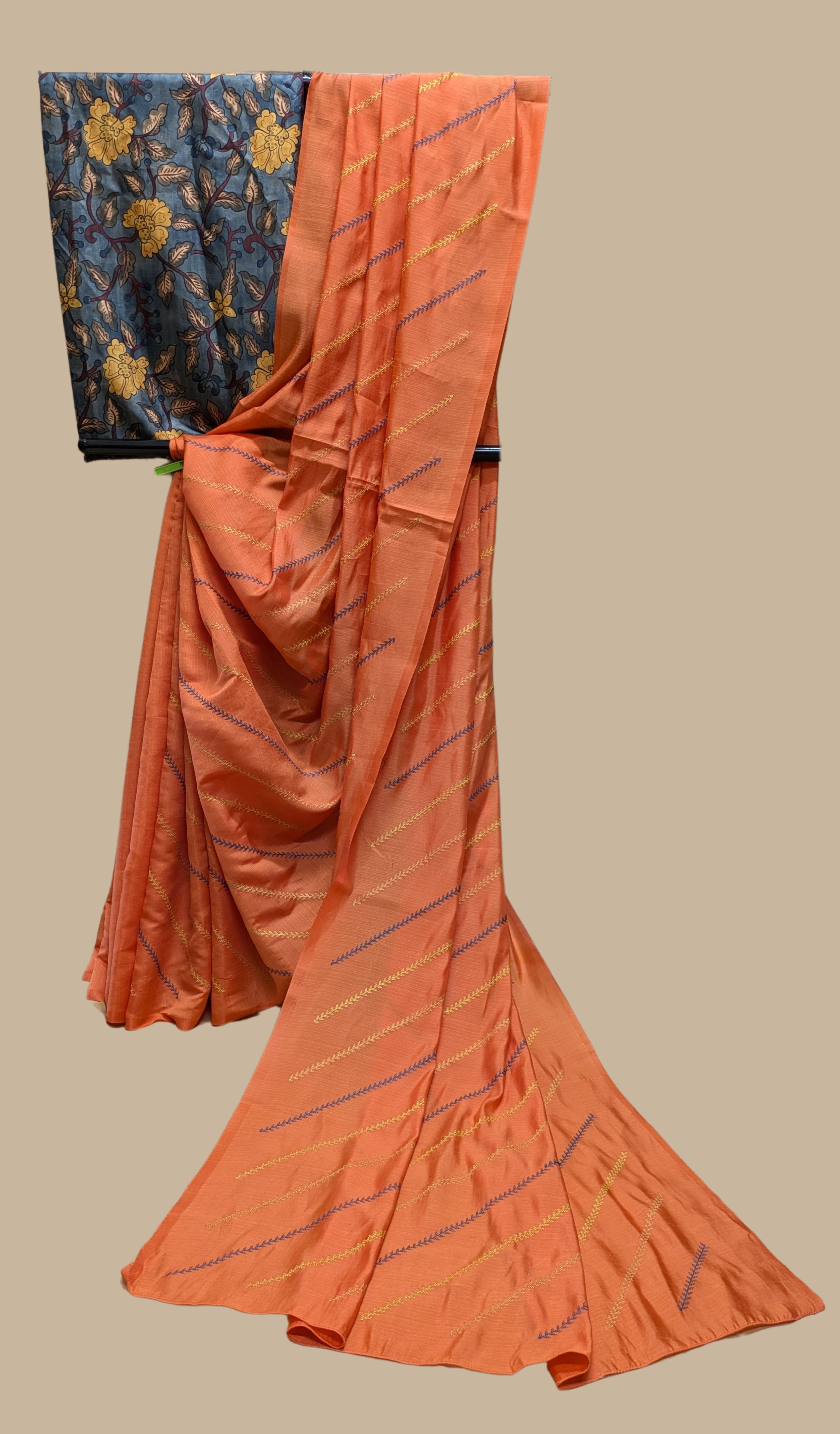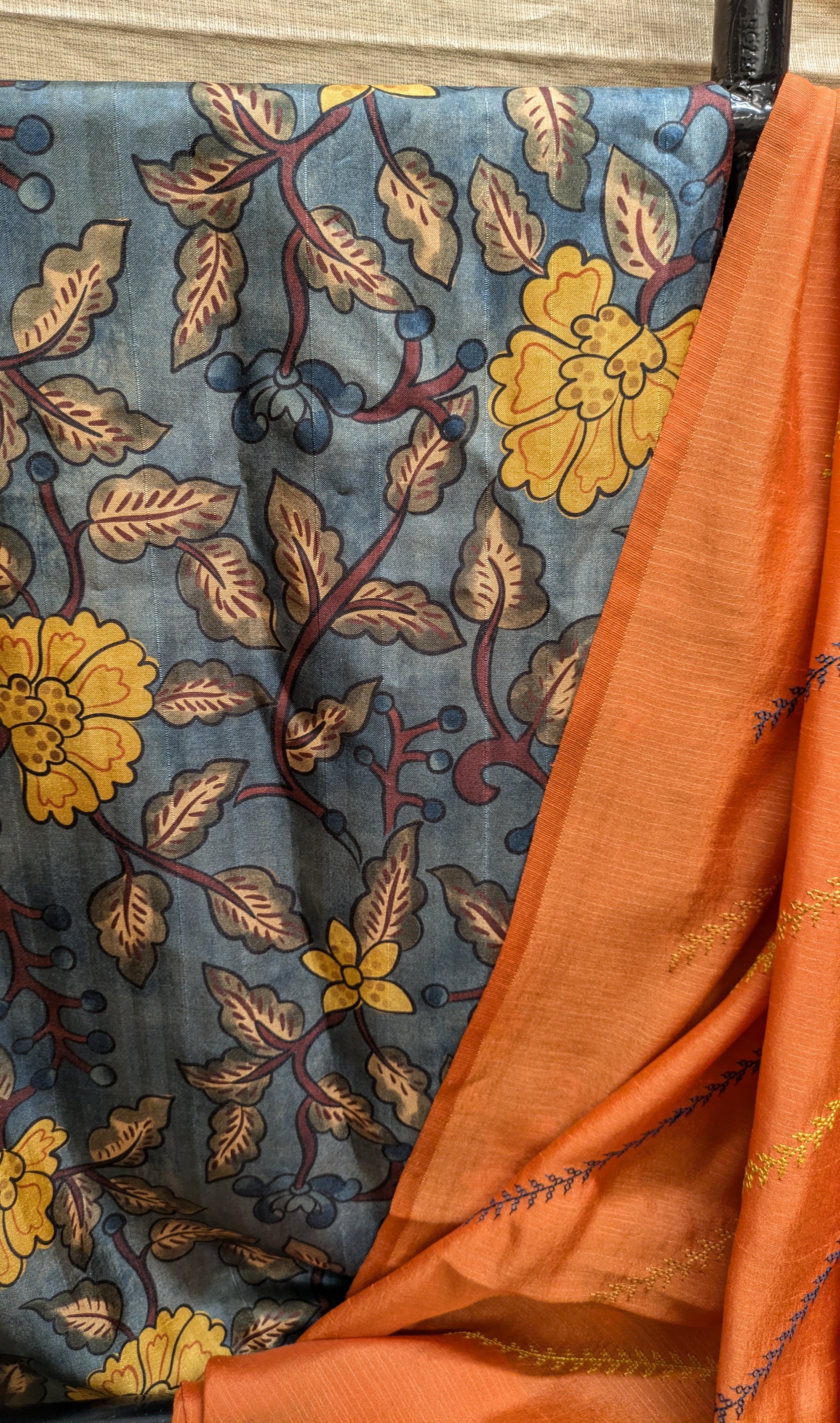 A simple, elegant blended linen saree paired with a beautifully contrast Kasuti embroidered blouse. Lightweight, designer, and effortlessly stylish, this saree features matching tassels for a complete, chic look.