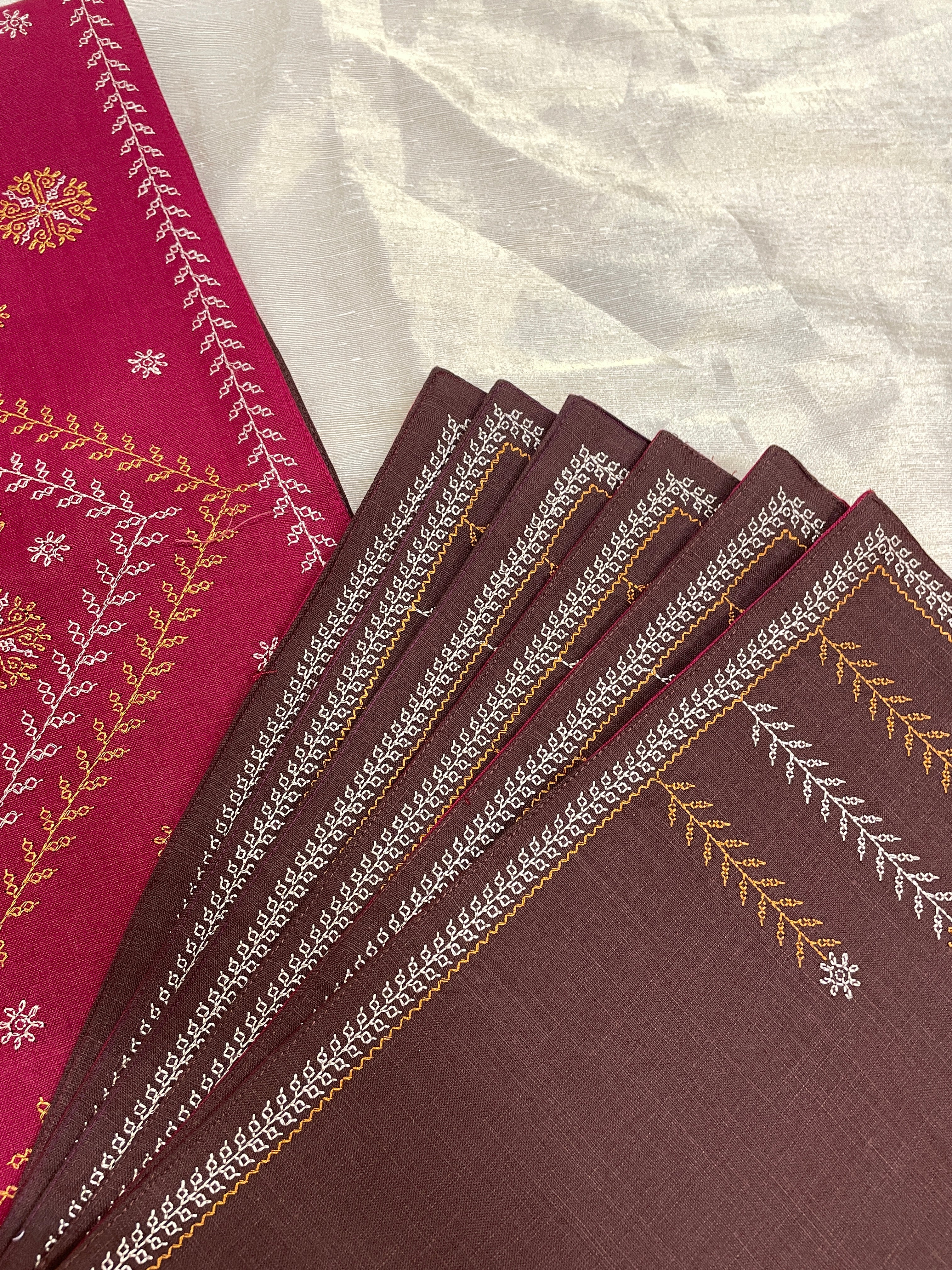 Garike Kasuti Collection – Inspired by Karnataka’s wildflowers, each piece features intricate Kasuti embroidery on a soft linen-cotton blend. Designed to blend tradition with modern elegance, these runners and mats add a touch of floral charm to your home while celebrating timeless heritage.