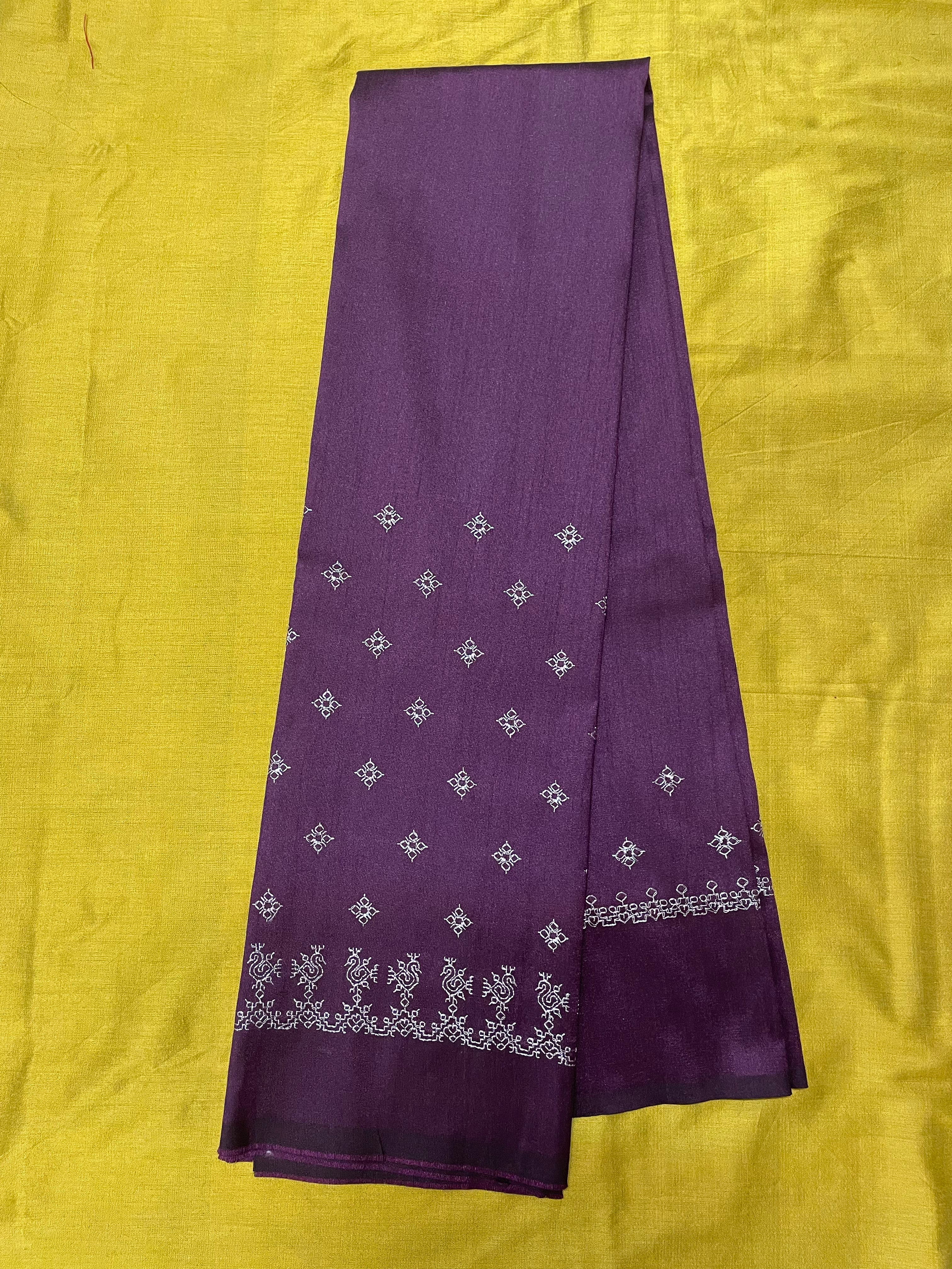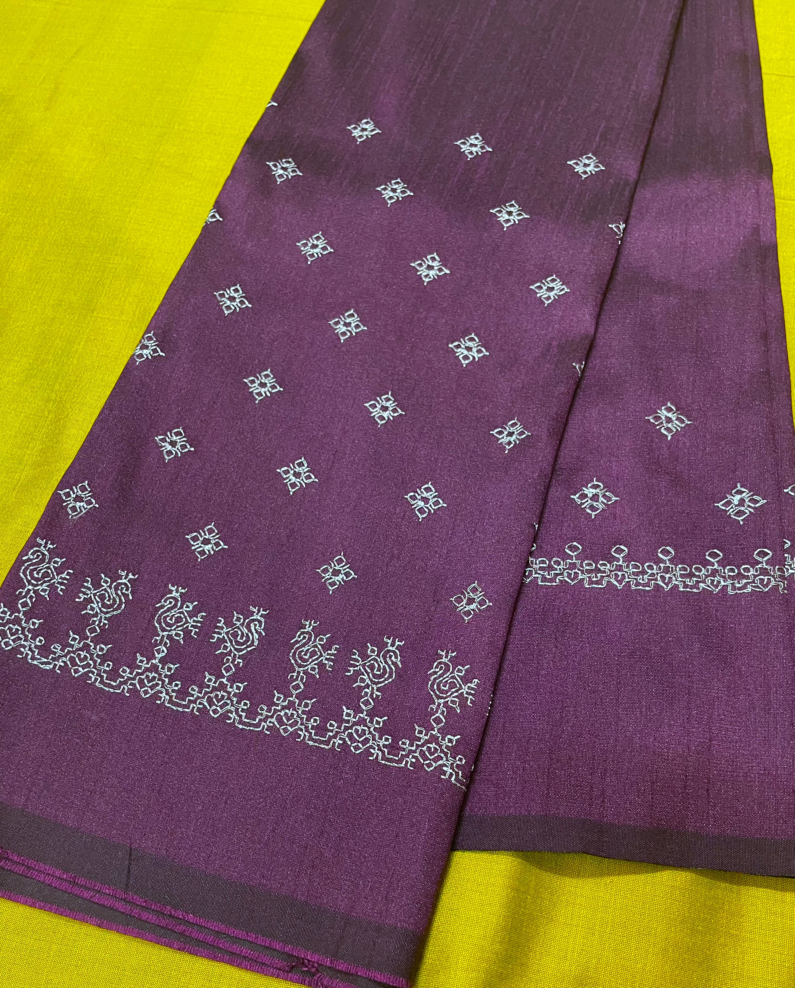 This Kasuti embroidered kurta material features delicate flora and fauna motifs inspired by Chitrakoot. Crafted in blended cotton silk with thread embroidery, it’s elegant, breathable, and perfect for everyday wear.