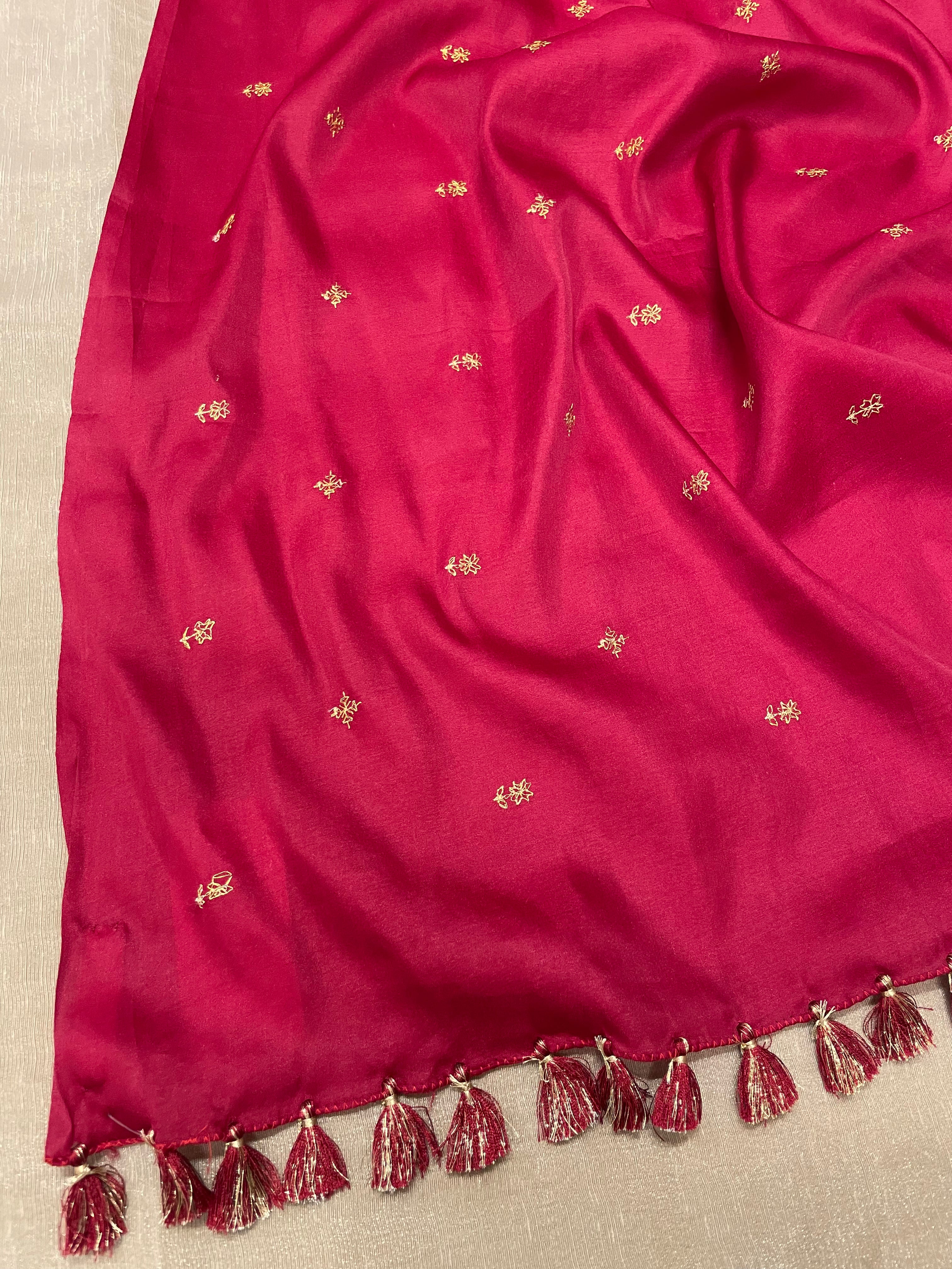 Elegant blended Chanderi saree with traditional Kasuti motifs, tasselled pallu, and a graceful drape. Perfect for festive occasions or casual wear, combining heritage charm with effortless style.
