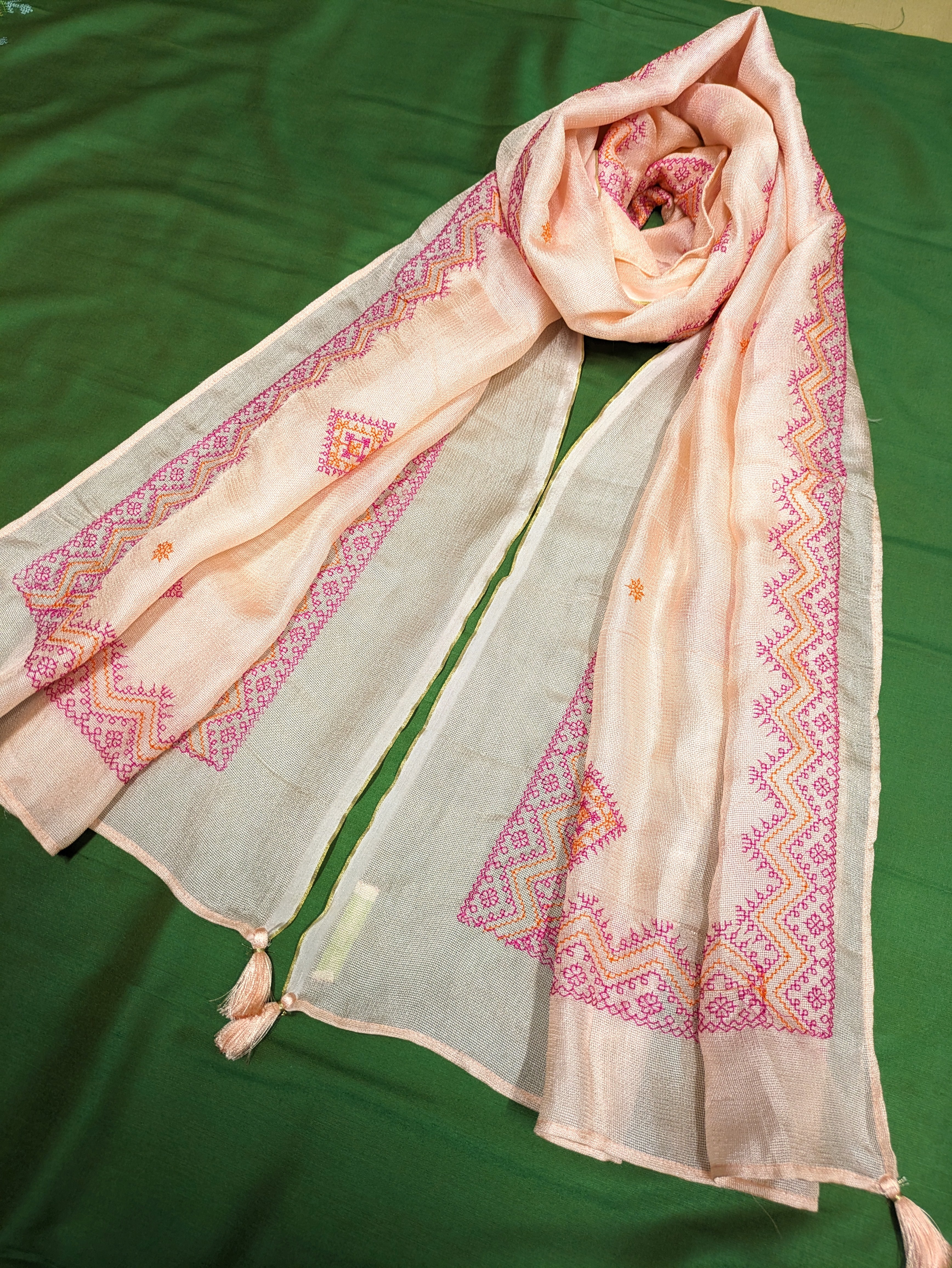 Lightweight and breezy, this georgette stole is adorned with traditional Kasuti embroidered borders and motifs. Finished with handmade tassels, it’s a versatile accessory to style with kurtas, dresses, or casual wear.