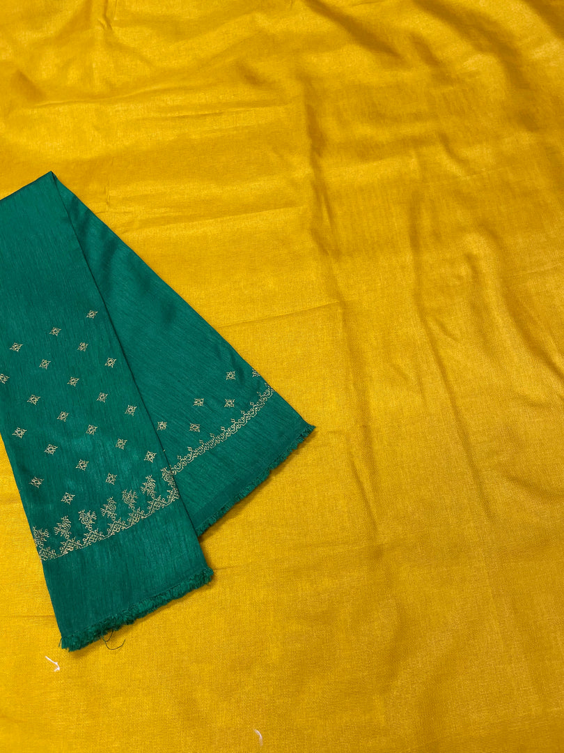A simple blended linen plain saree paired with a beautifully contrast embroidered blouse. This pair is designer, smart and effortless. This saree comes with a contrast tassle to match the blouse