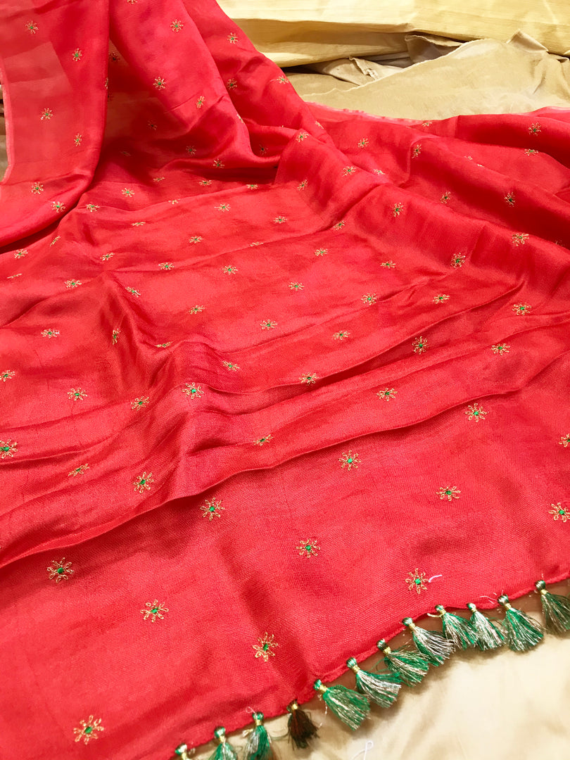Detailing: Gold Zari & Thread Machine embroidery and Tasselled edge pallu