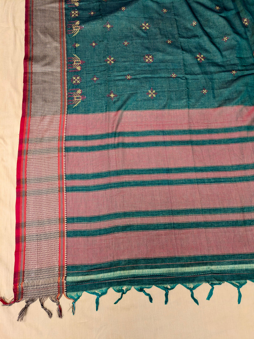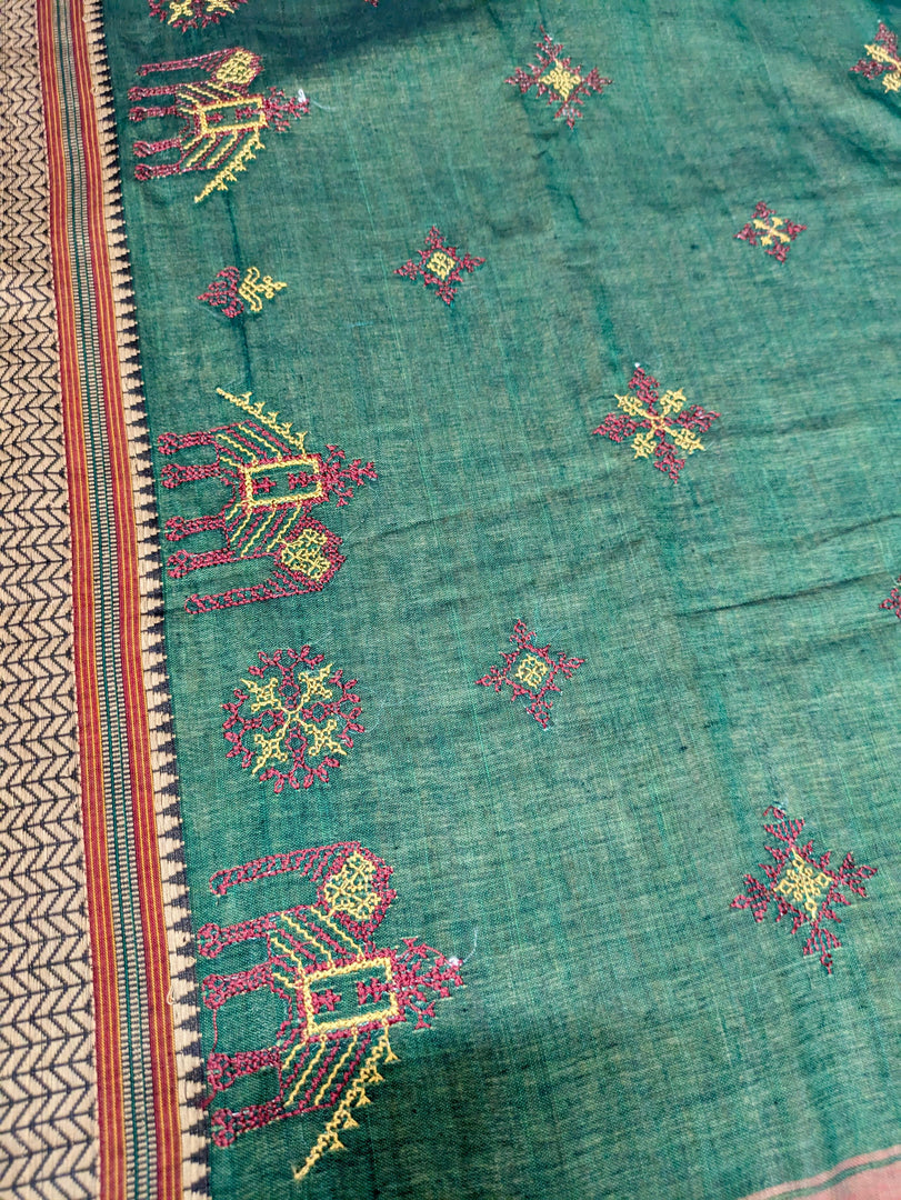 “Celebrate the grandeur of tradition with our Kasuti Handwoven Saree adorned with intricate elephant motifs. Inspired by the vibrant essence of temple processions, this saree brings to life the festive spirit of India. The meticulously machine-embroidered motifs symbolize strength, grace, and prosperity, making it perfect for weddings, festivals, and cultural celebrations. Woven with care, this saree combines timeless tradition with a modern touch, offering a rich blend of elegance and cultural heritage.