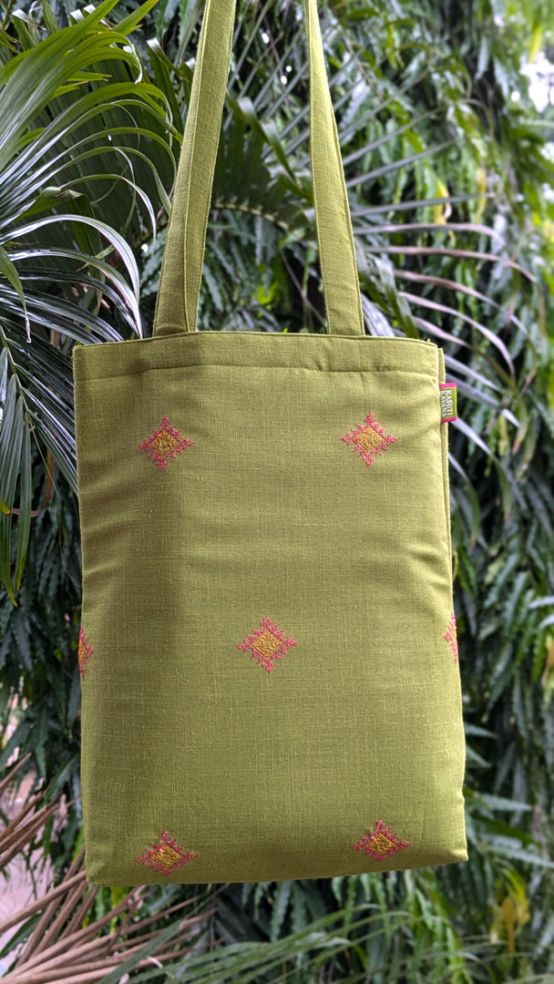 Description: Our Kasuti embroidered tote bags are a beautiful blend of heritage and utility. Inspired by the centuries-old Kasuti embroidery of North Karnataka, each bag features delicate motifs that celebrate tradition — star/flower patterns — reimagined for modern life.