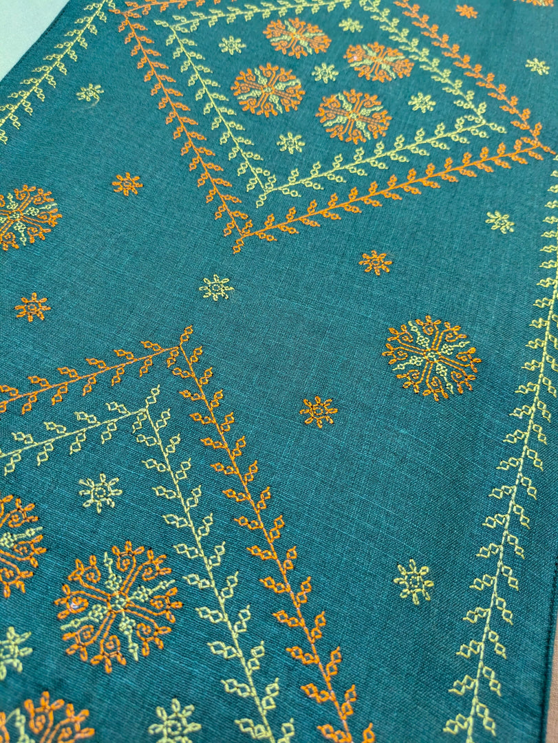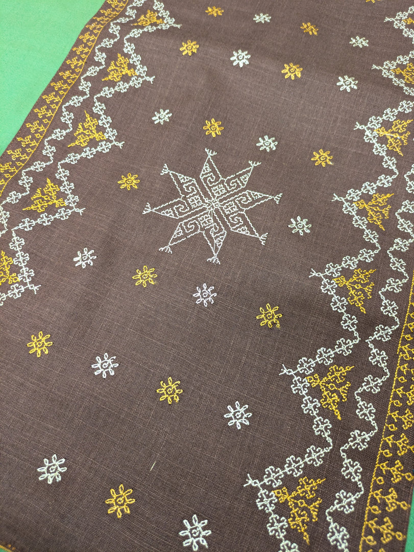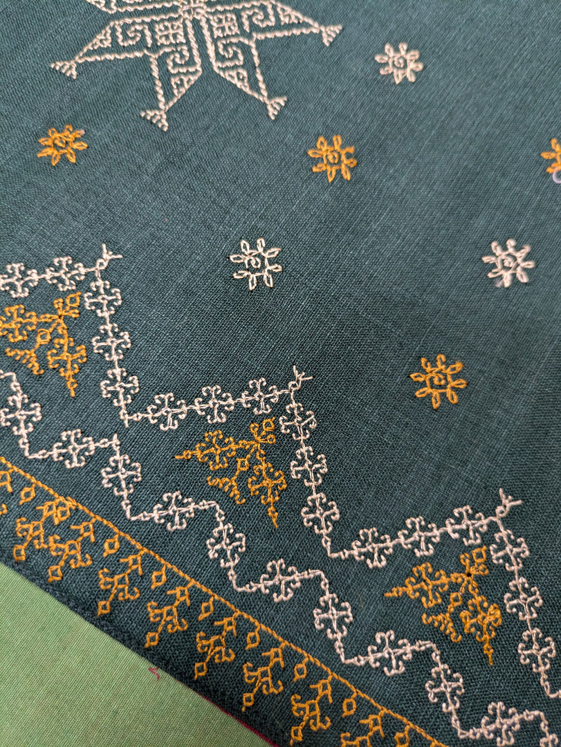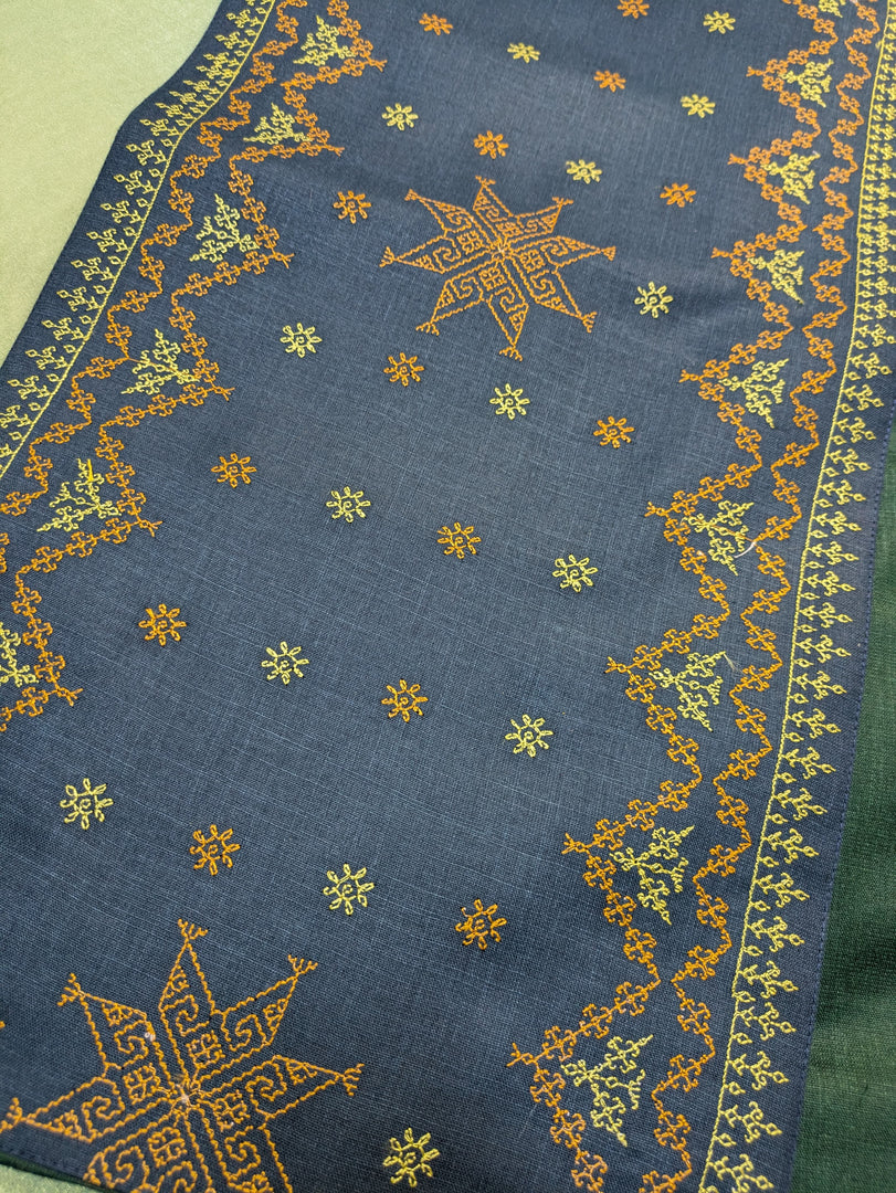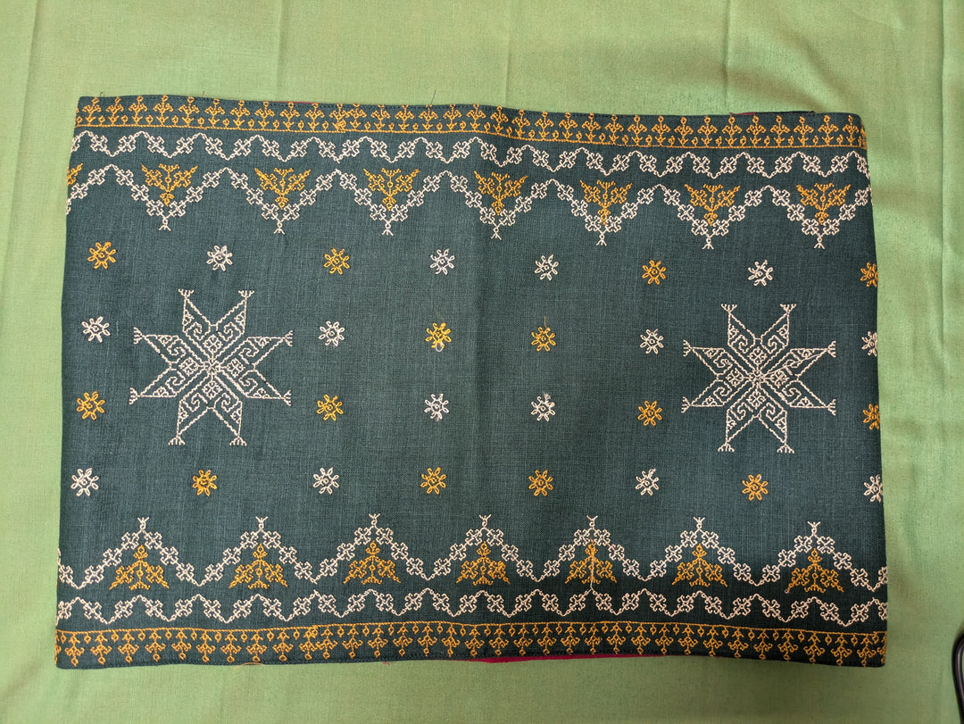 Add a touch of elegance to your home with these table runners in delicately embroidered kasuti temple borders with traditional star motifs. These pieces are sure to brighten up any space and add beautiful details to every meal conversation. Made in traditional folk embroidered kasuti motifs, these are also perfect gifts, souvenirs for festivities and guests. Reach out to our team for bulk orders and customisation for quantities.
