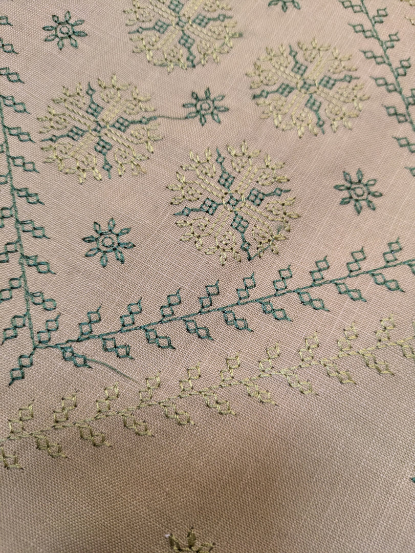 Load image into Gallery viewer, green wildflower table runner showing stitched wildflower motif detail