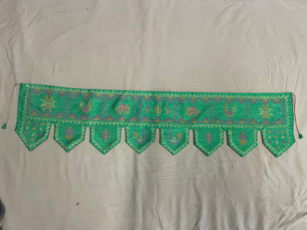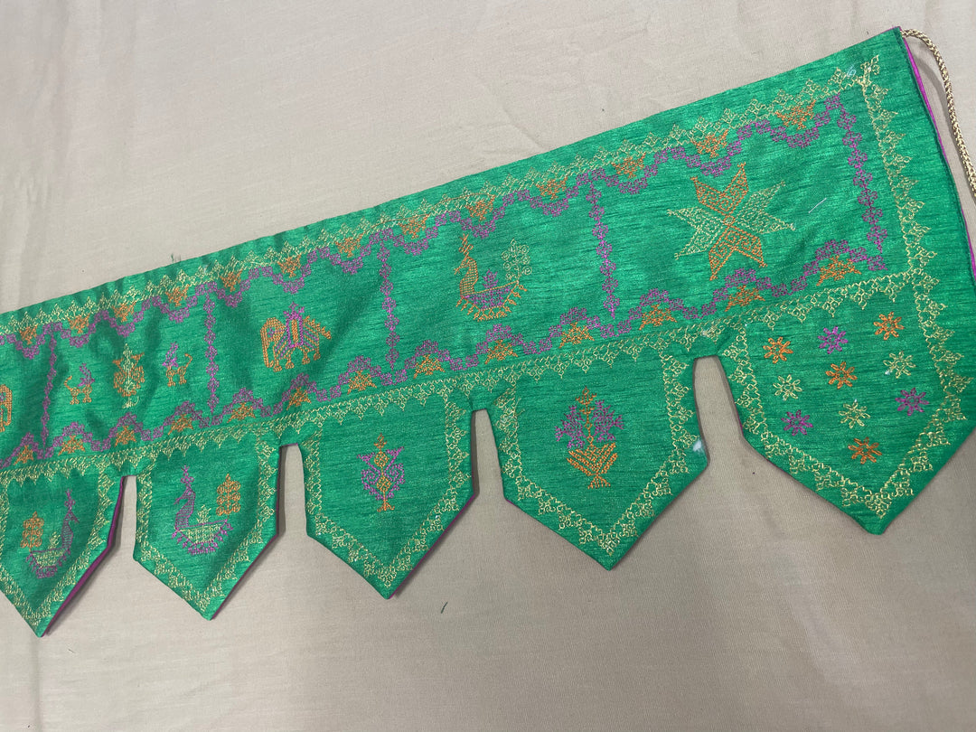 Description: This toran celebrates Kubera the hindu god of wealth. Made in intricate kasuti motifs signifying flora, fauna and animals that depict abundance, we make these in rich colours that bring you prosperity, wealth and the spirit of celebration. A multi-colour riot of colours in delightful kasuti embroidered fabrics, this toran brings the warmth and celebration to the entryway to your home, pooja room or doors. Made in traditional folk embroidered kasuti motifs, these are also perfect gifts, souvenirs for festivities and guests. Reach out to our team for bulk orders and customisation for quantities.