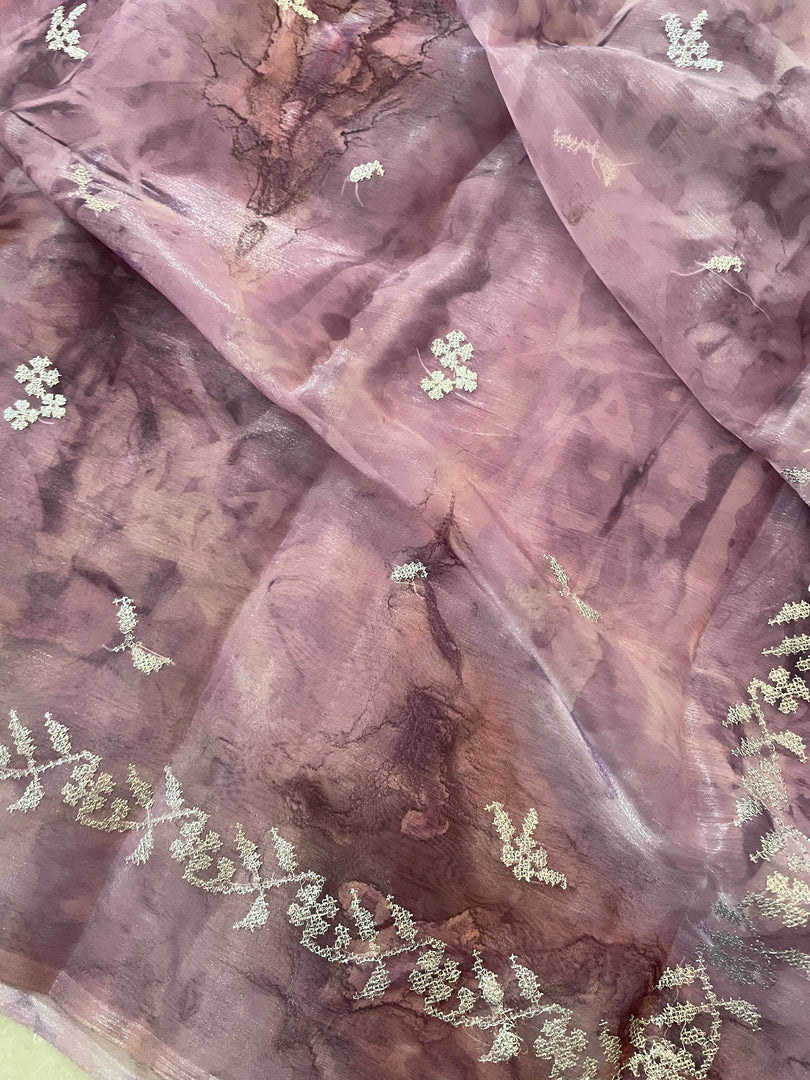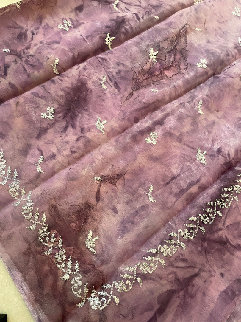 milkyway tie-dye periwinkle organza saree showing embroidery details
