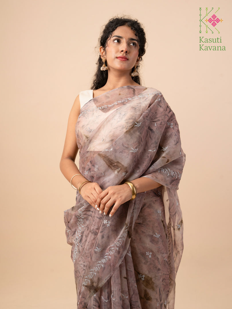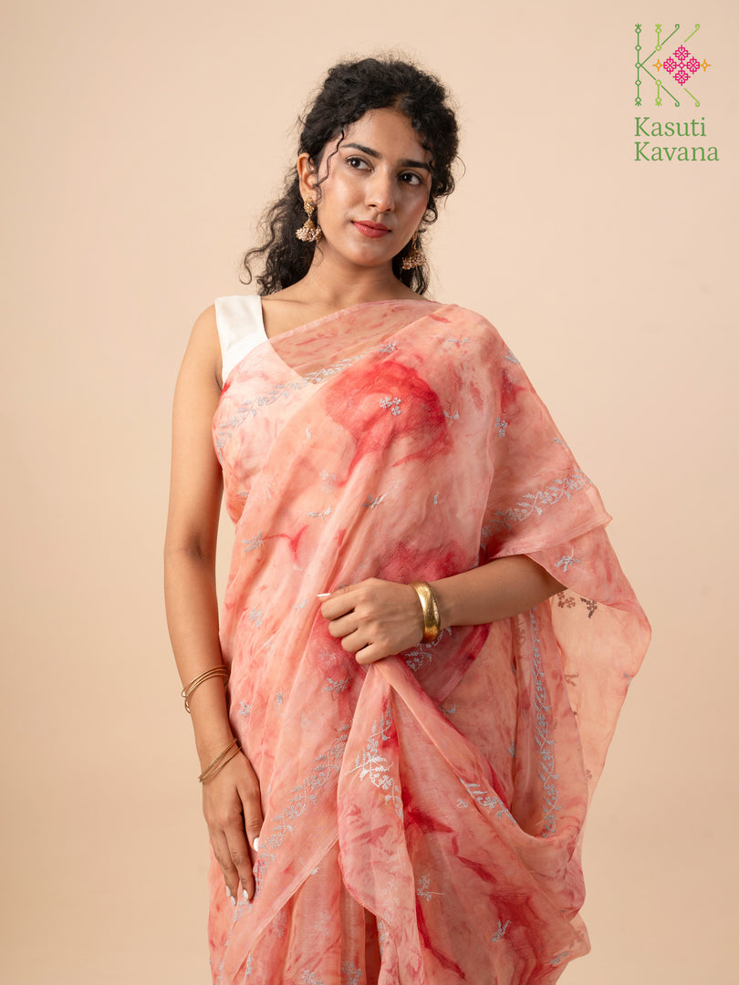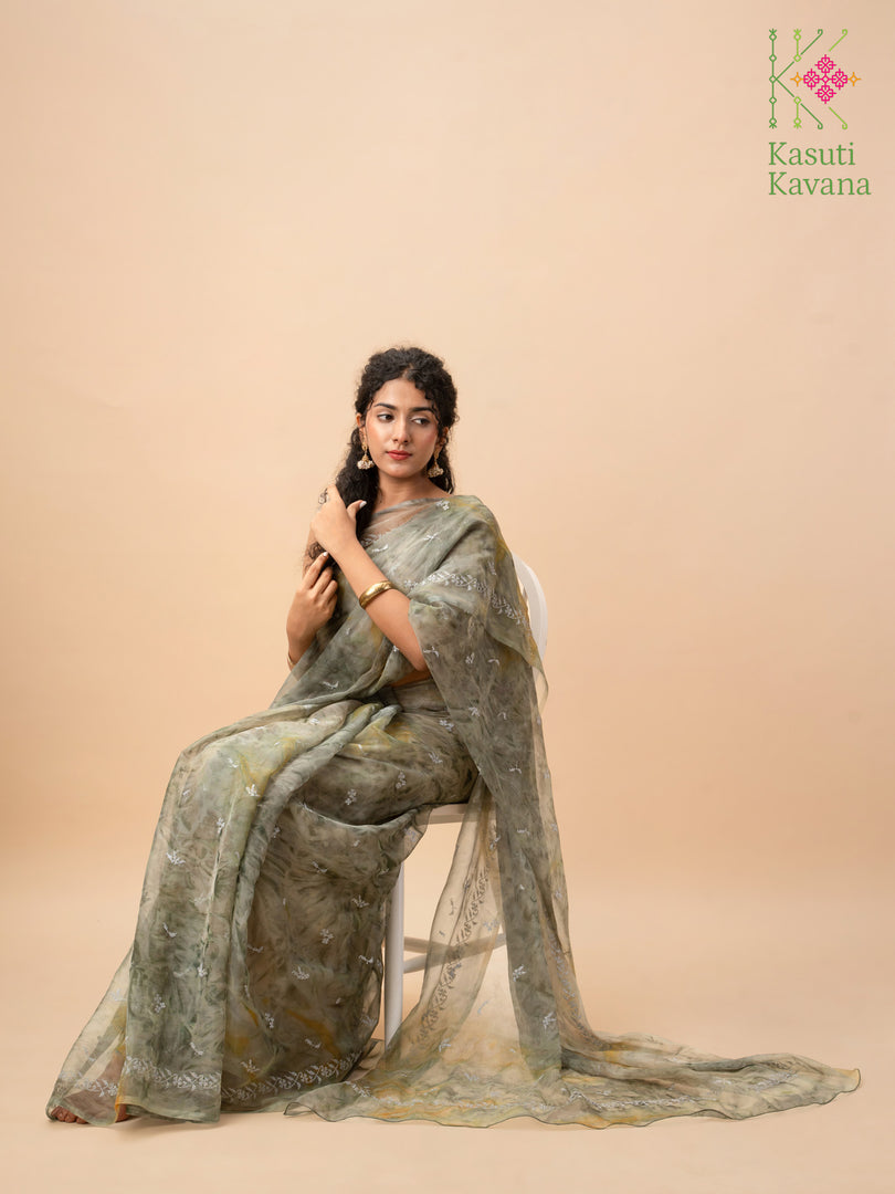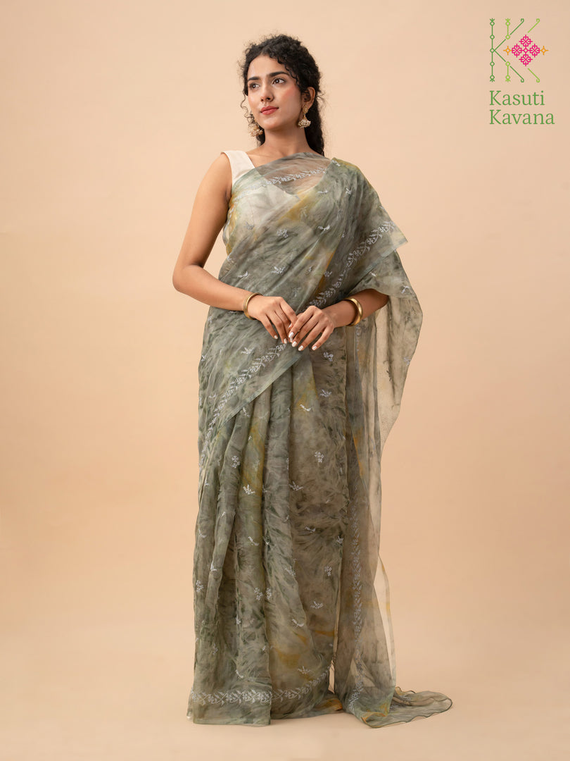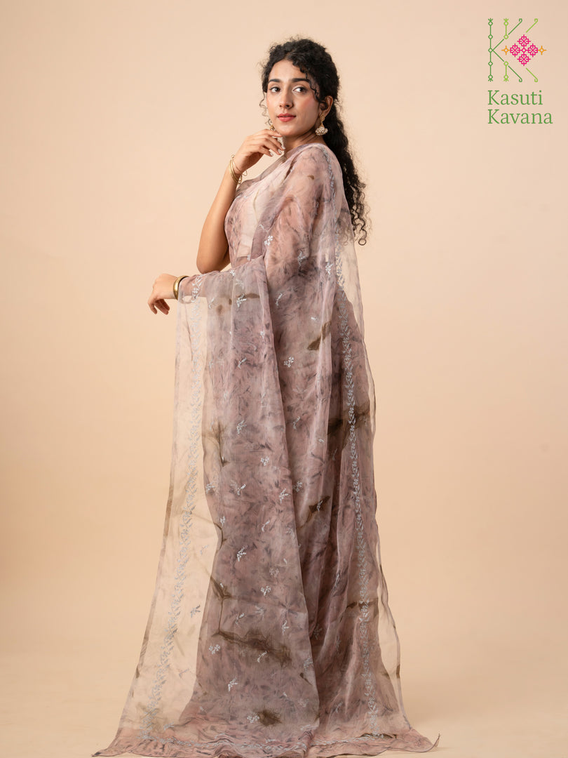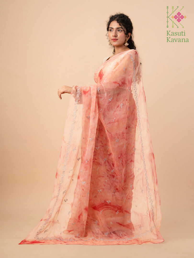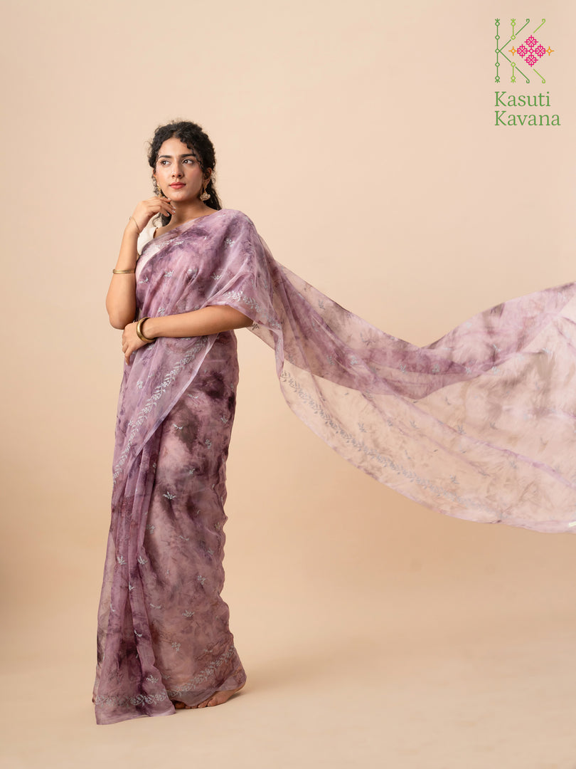 Perennial collection of Cross stitch Kasuti Periwinkle blooms over Tie-dye Organza, making your day feel like a walk in the garden. Perfect for everyday wear or a beach wedding. A surreal organza saree that is easy to drape, has a wonderful fall, and makes you feel like a real queen.