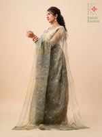 Tie-dye blended organza saree with cross-stitch Kasuti periwinkle blooms and silver zari embroidery. Lightweight with a graceful fall, perfect for everyday wear or special celebrations.